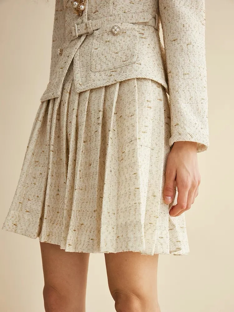 Conjunto de Tweed com Pedrarias – Blazer com Decote V e Saia Plissada de Cintura Alta