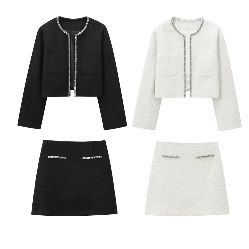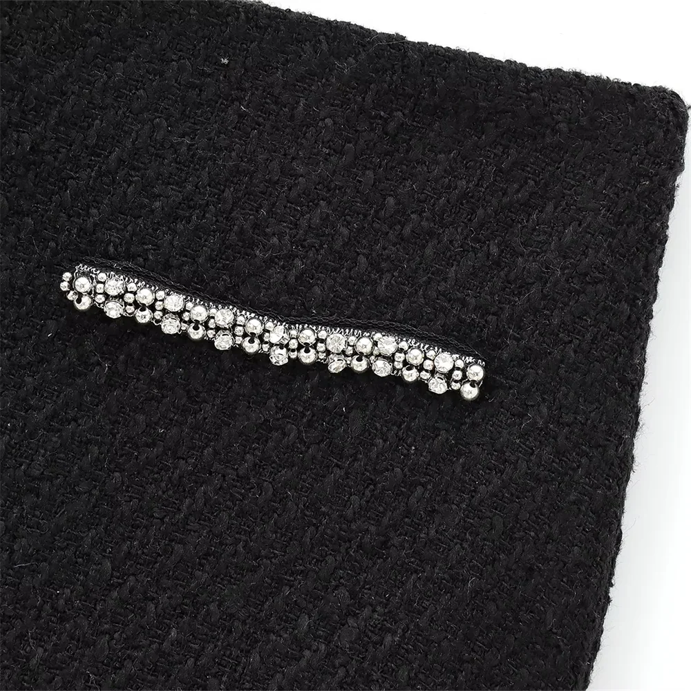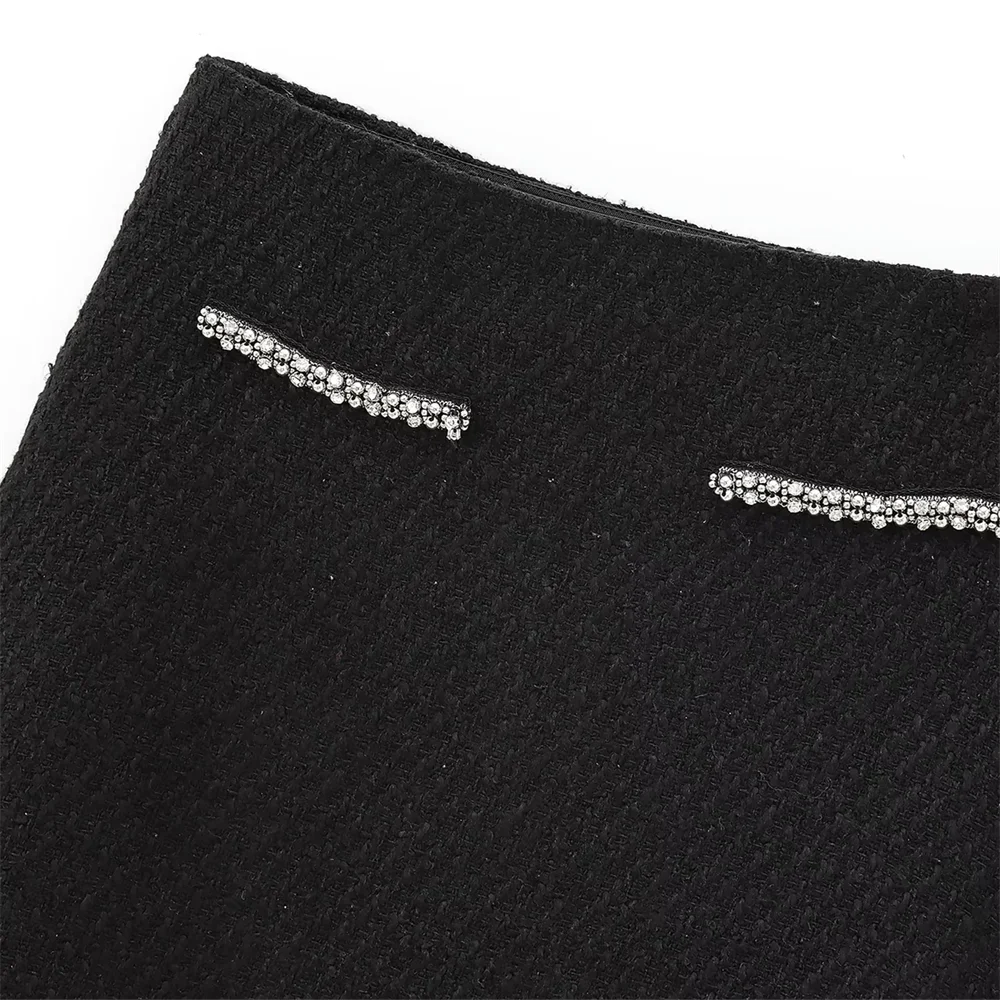Um toque de luxo para o seu closet. Este conjunto elegante une a sofisticação moderna à versatilidade clássica. A jaqueta curta é ricamente decorada com strass bordados à mão, criando pontos de brilho refinados que elevam qualquer produção. A saia de cintura alta, com caimento impecável, valoriza a silhueta com um toque contemporâneo e feminino.