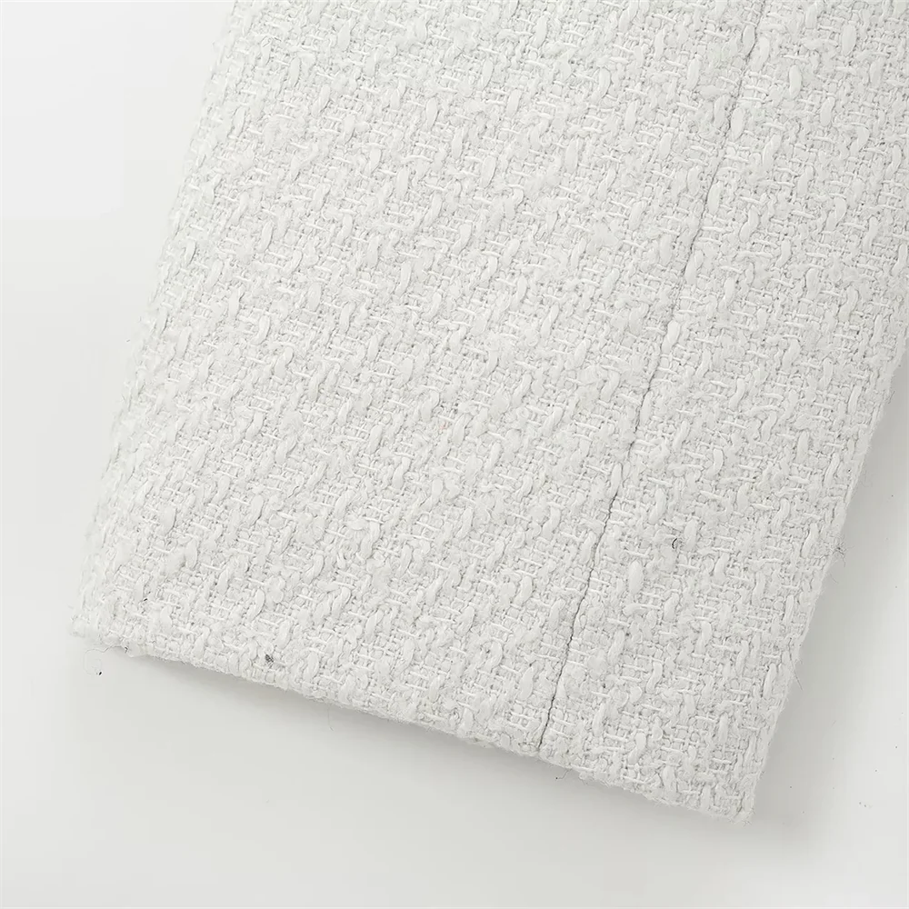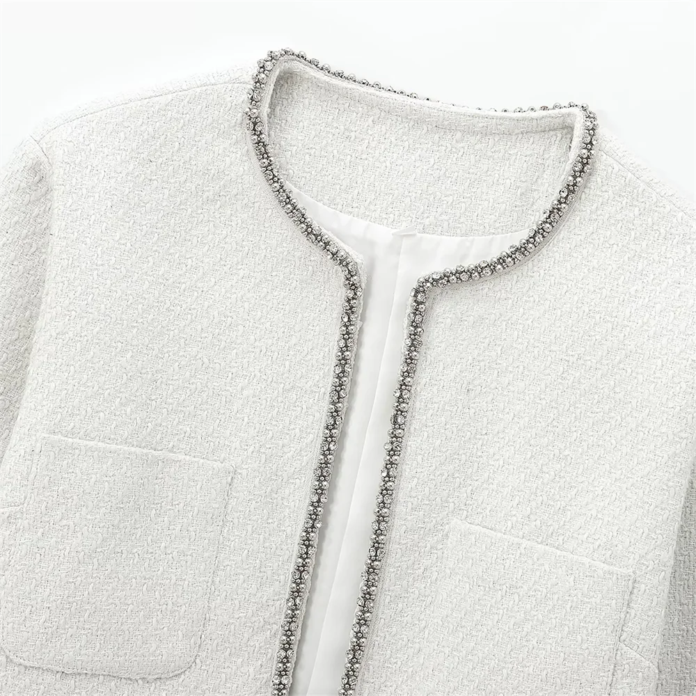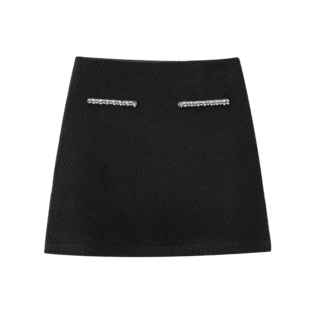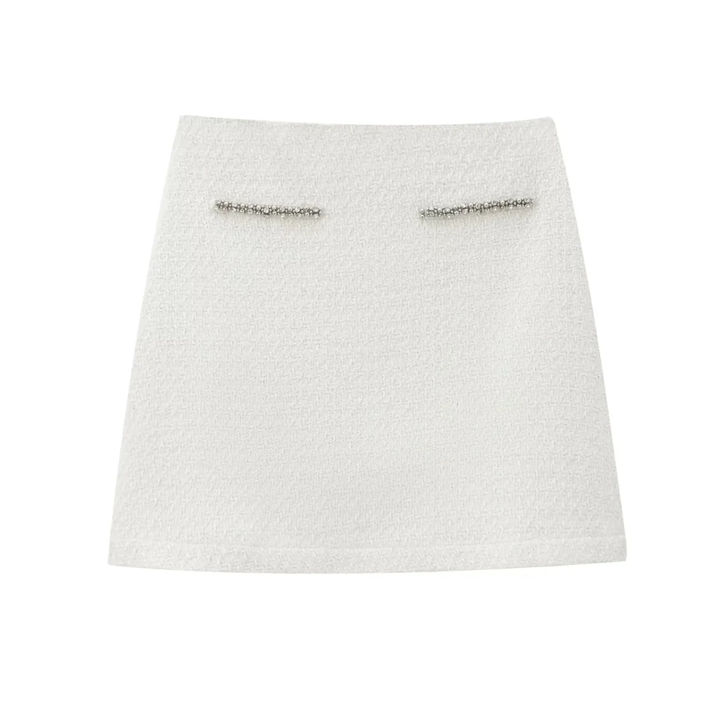 Um toque de luxo para o seu closet. Este conjunto elegante une a sofisticação moderna à versatilidade clássica. A jaqueta curta é ricamente decorada com strass bordados à mão, criando pontos de brilho refinados que elevam qualquer produção. A saia de cintura alta, com caimento impecável, valoriza a silhueta com um toque contemporâneo e feminino.