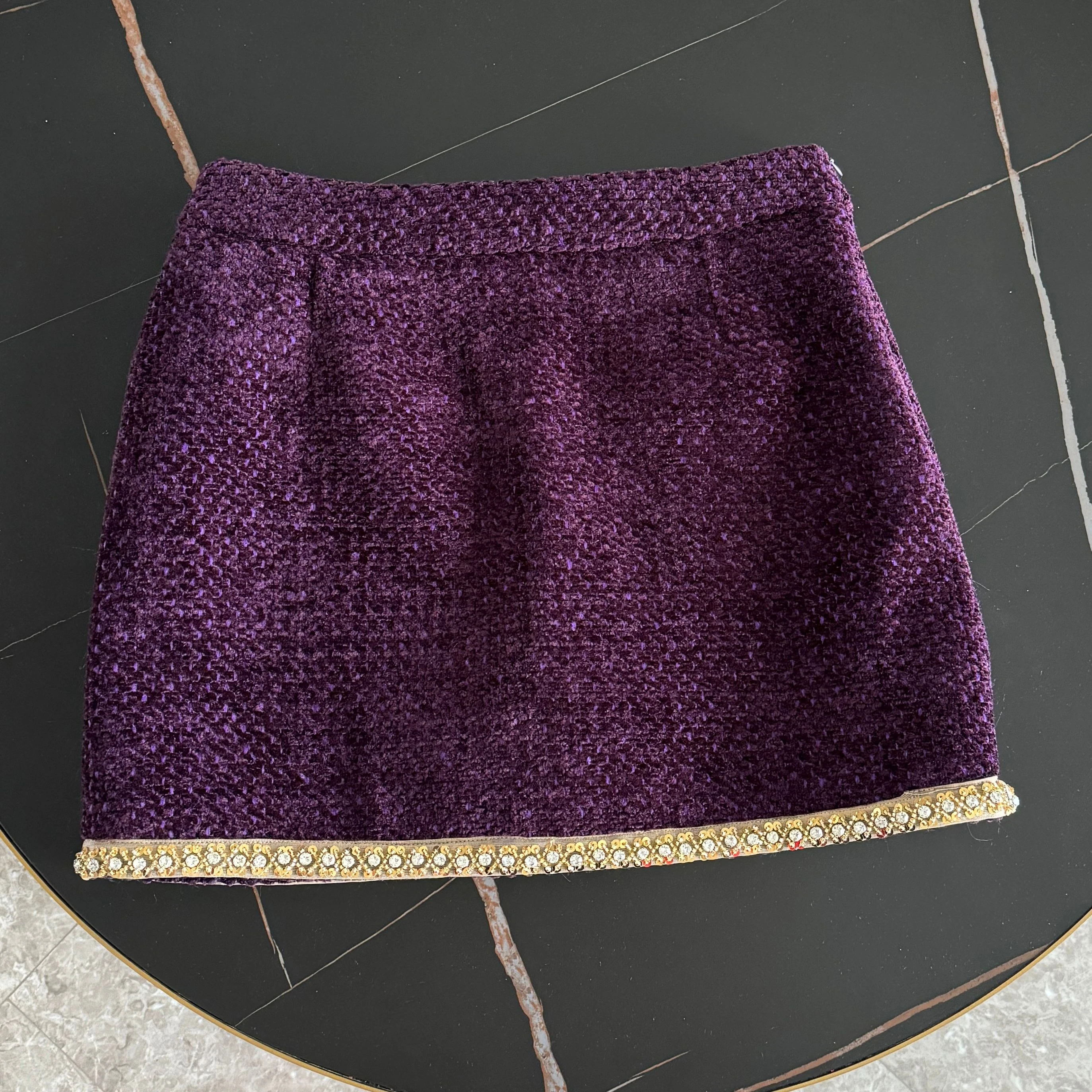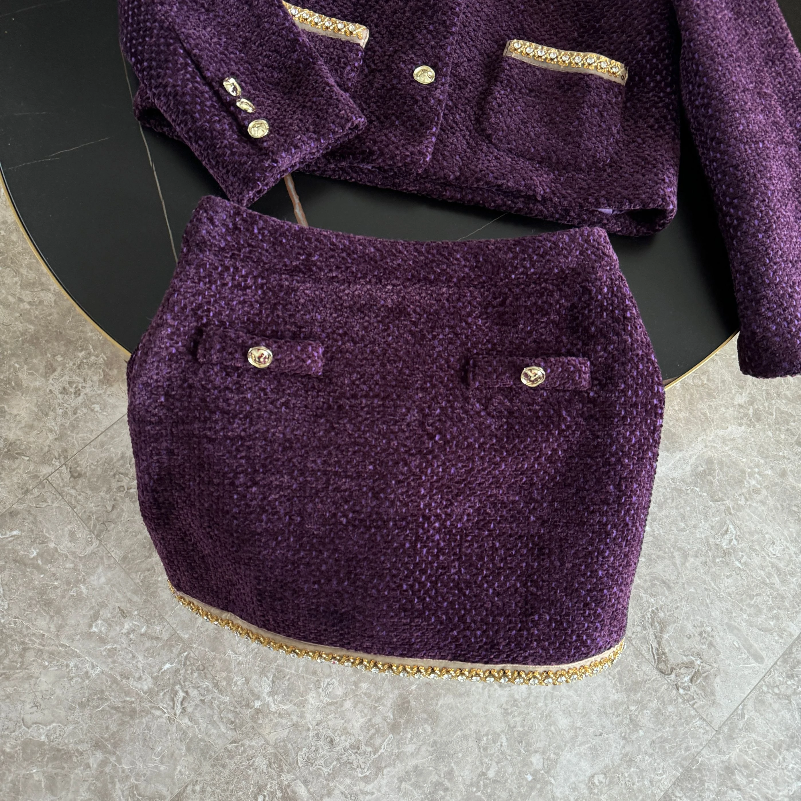 Conjunto em Tweed – Blazer com Aplicações de Strass e Saia Mini Elegante