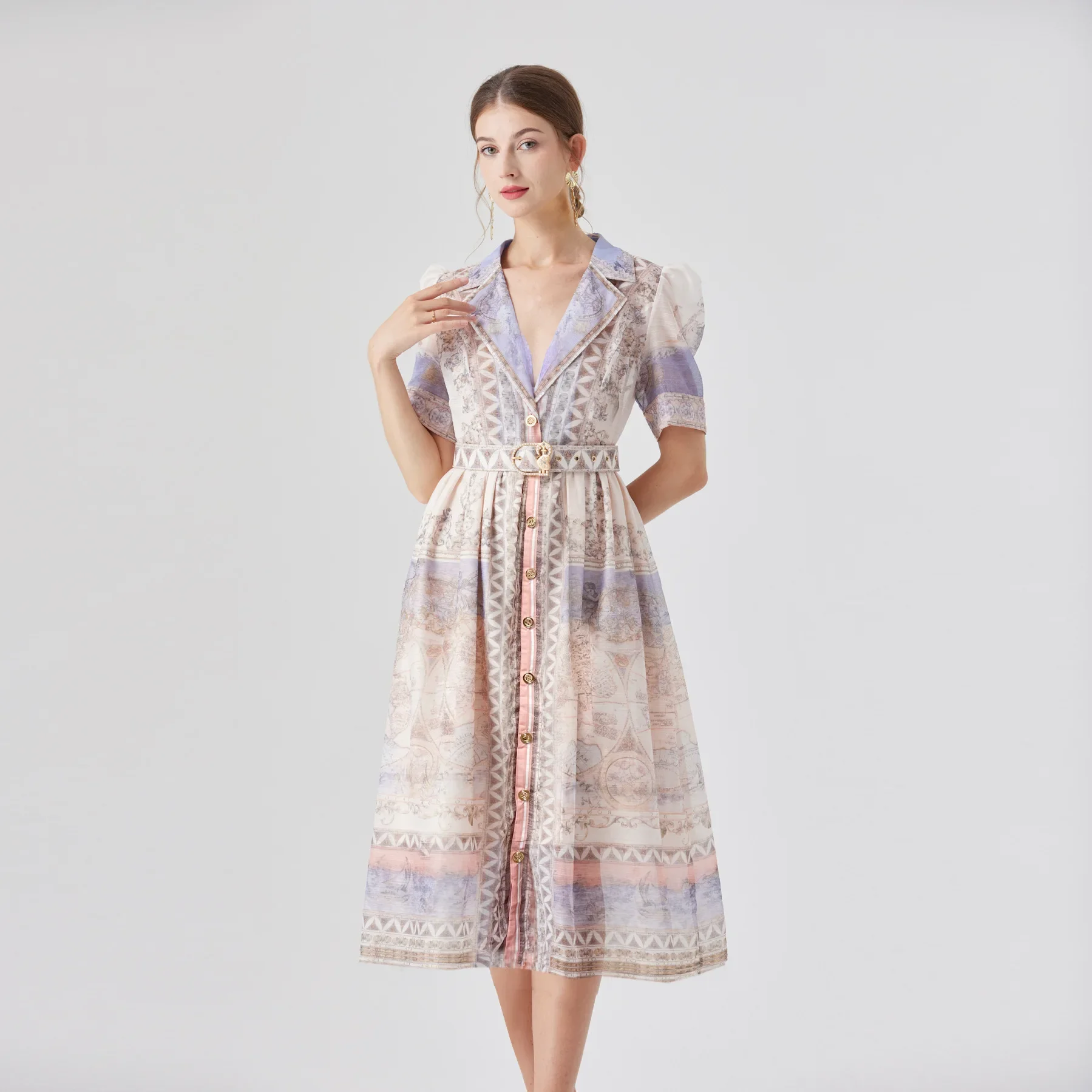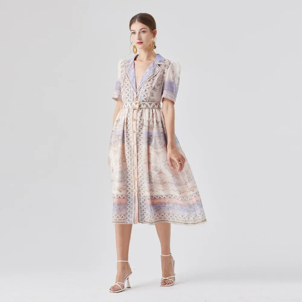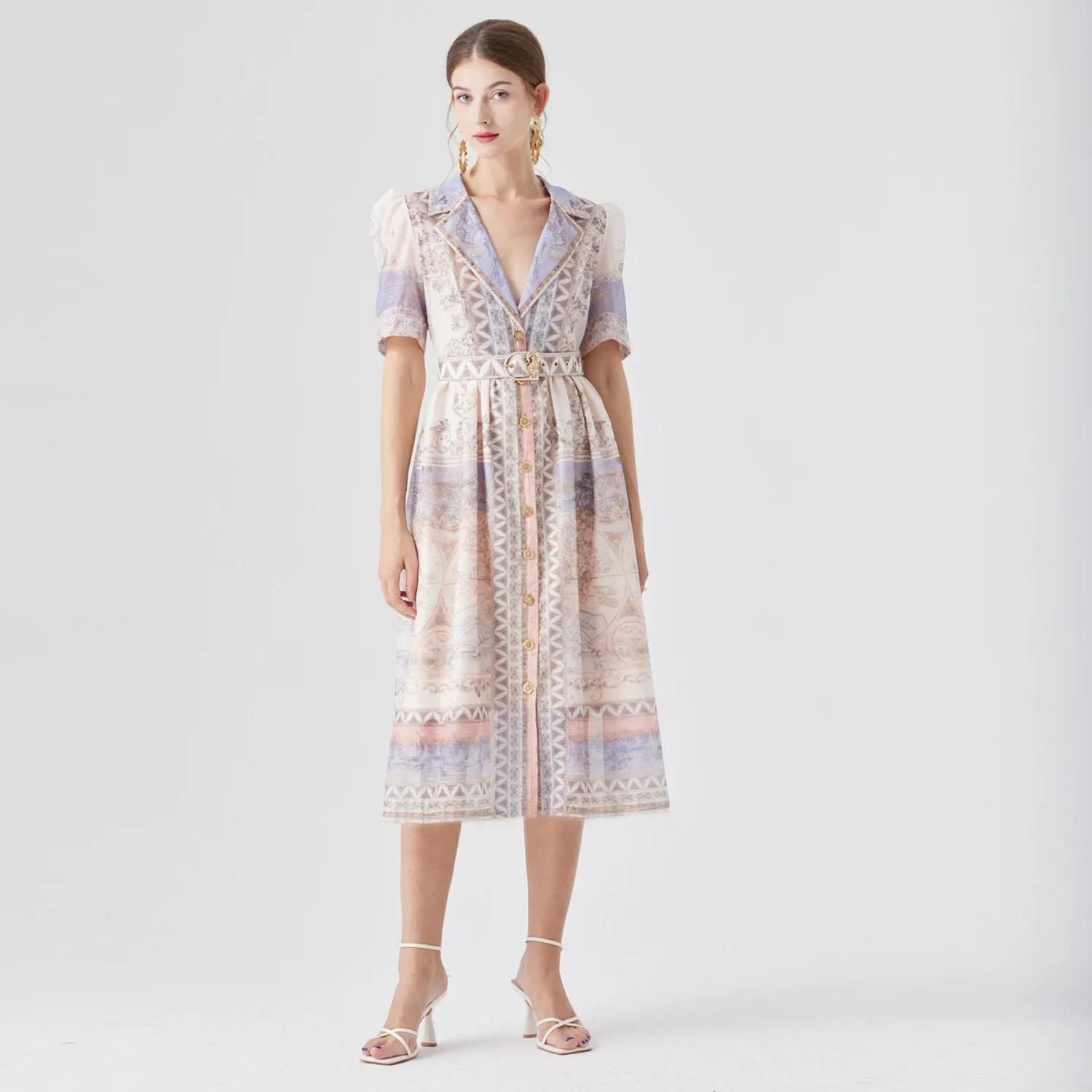 Vestido Estampado, Cintura Marcada e Cinto Elegante