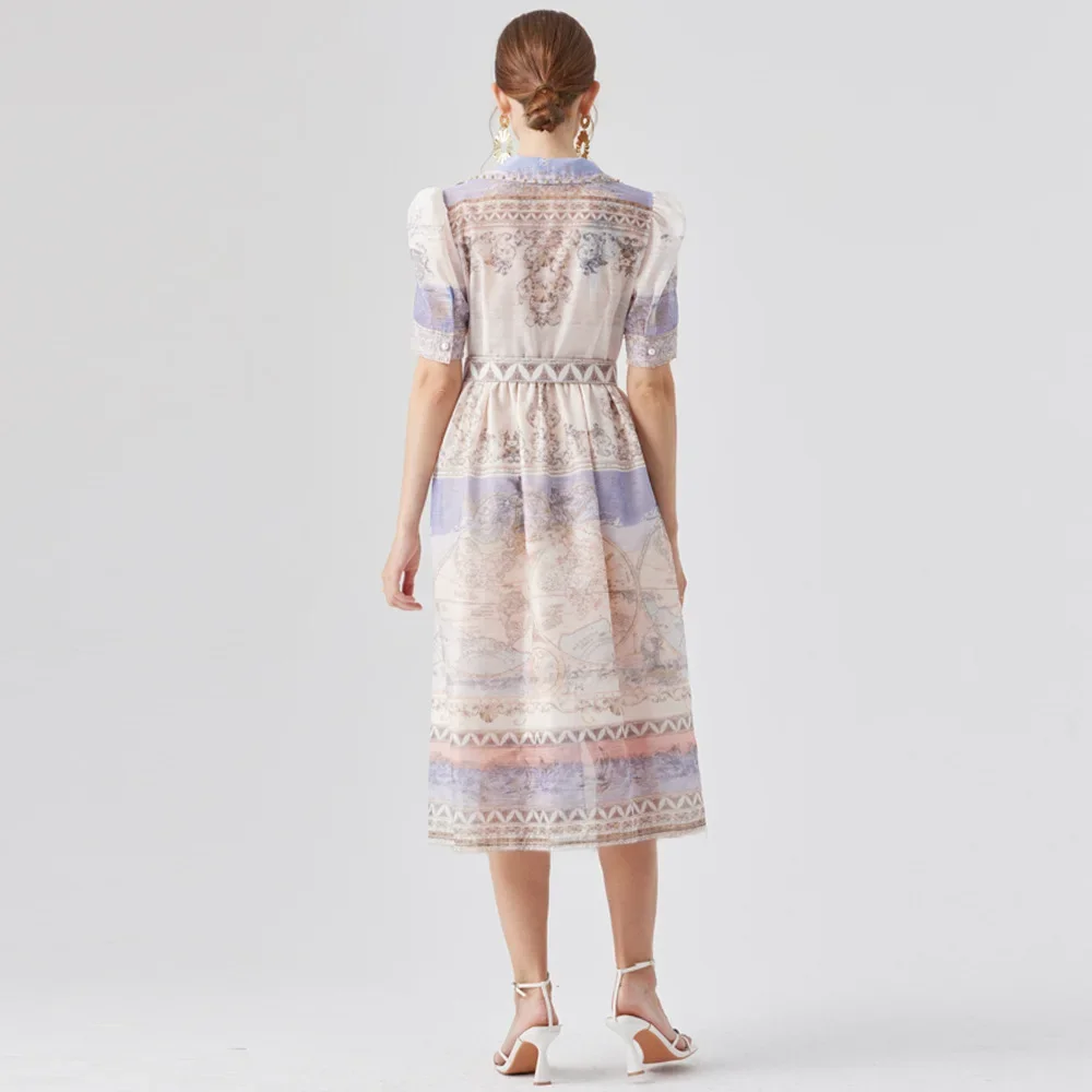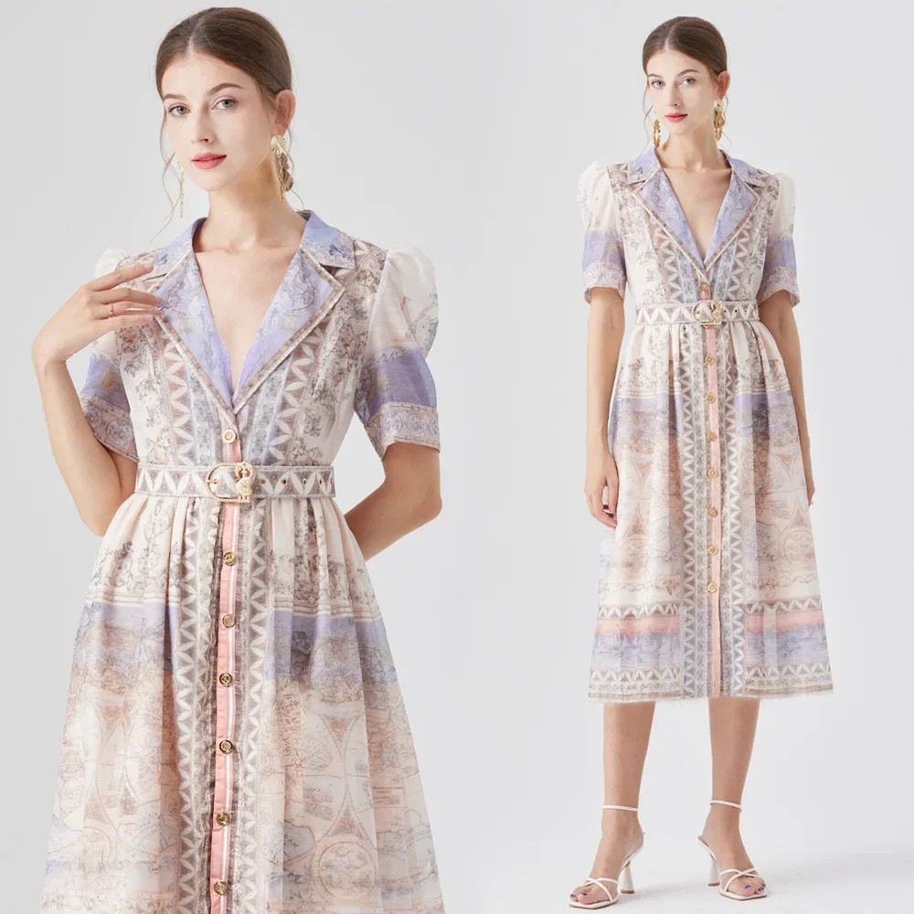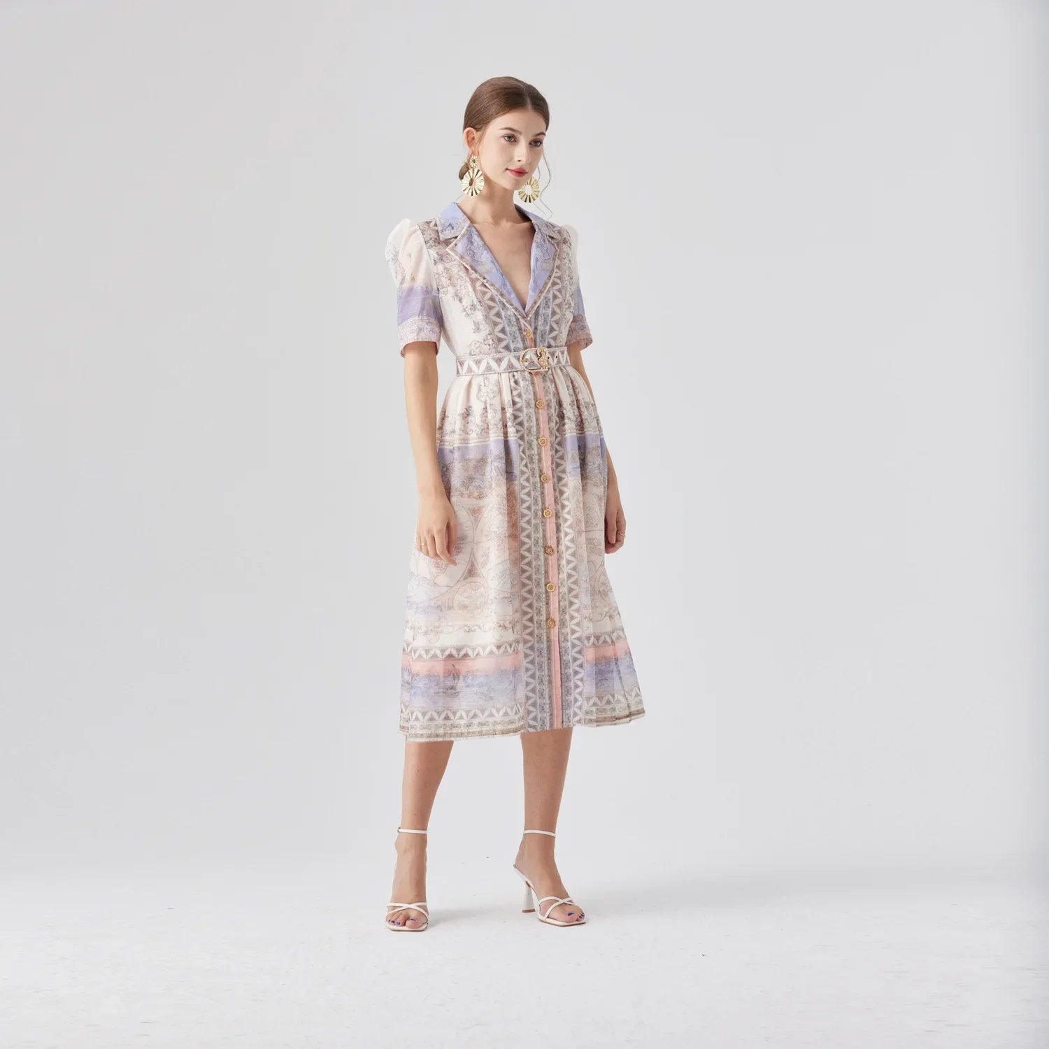 Vestido Estampado, Cintura Marcada e Cinto Elegante