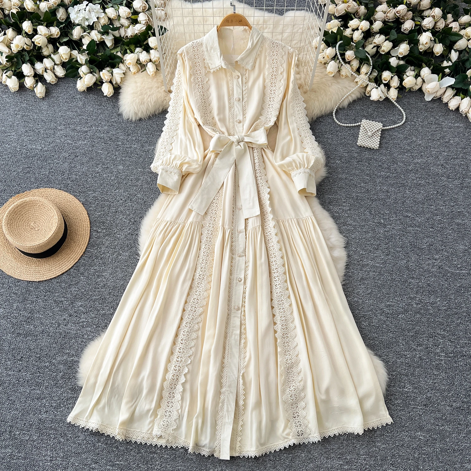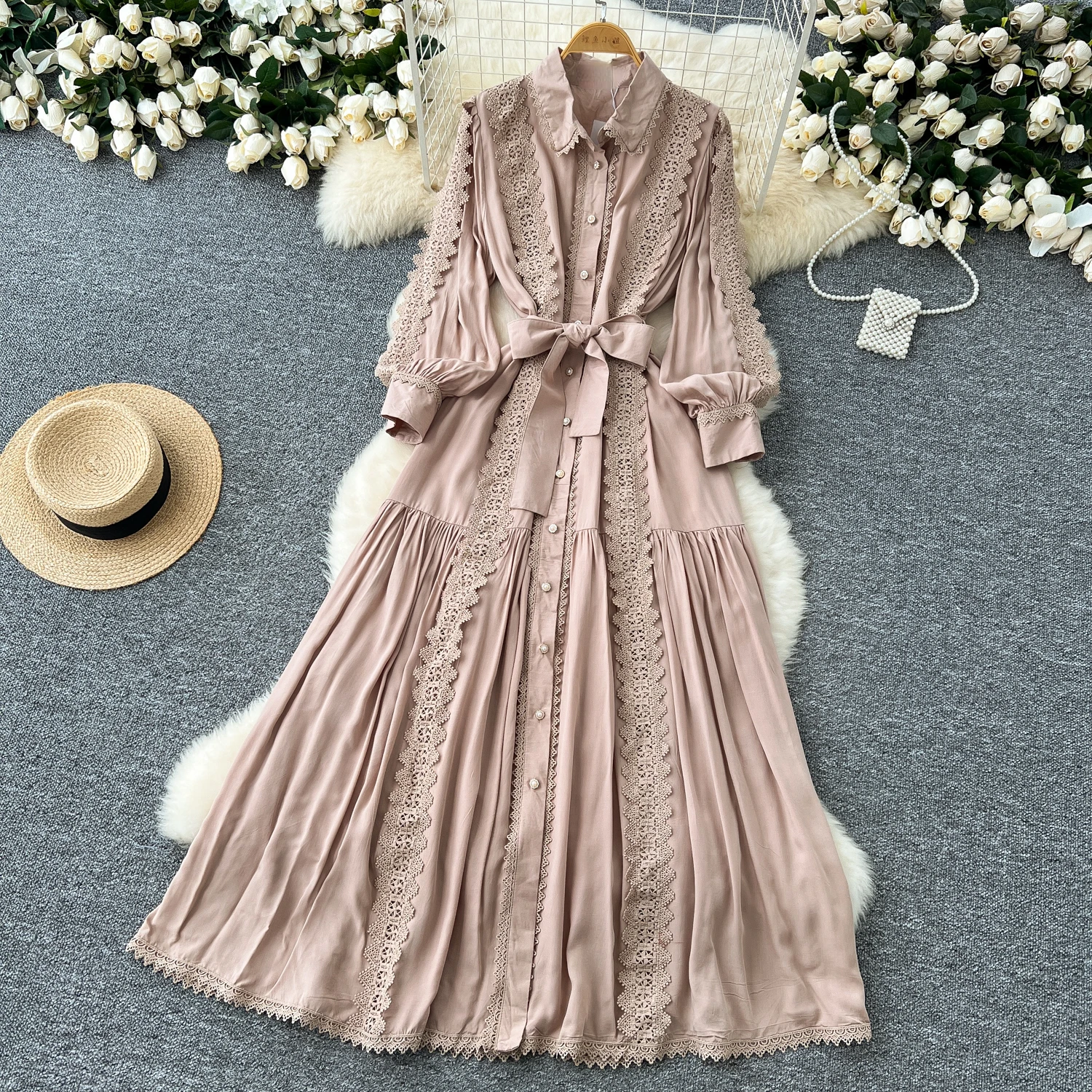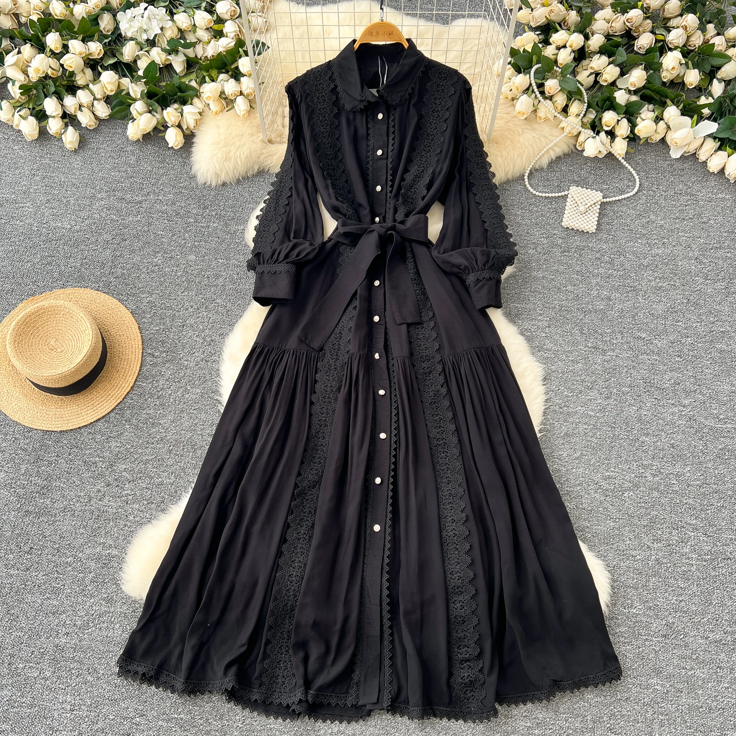 Vestido Longo com Renda e Botões Frontais – Modelagem A-line e Cintura Ajustável