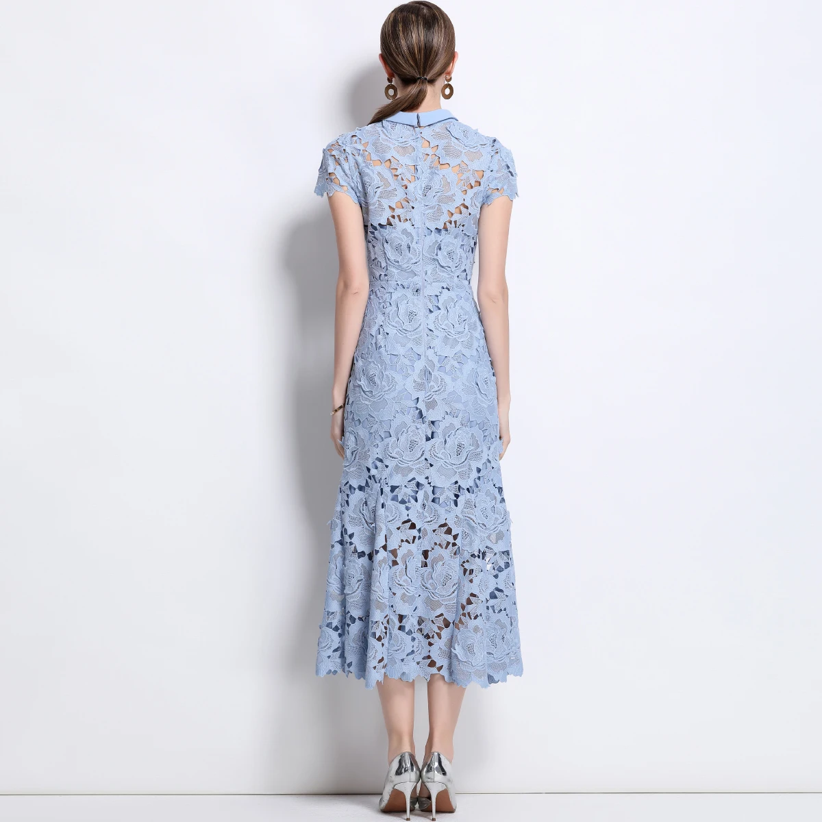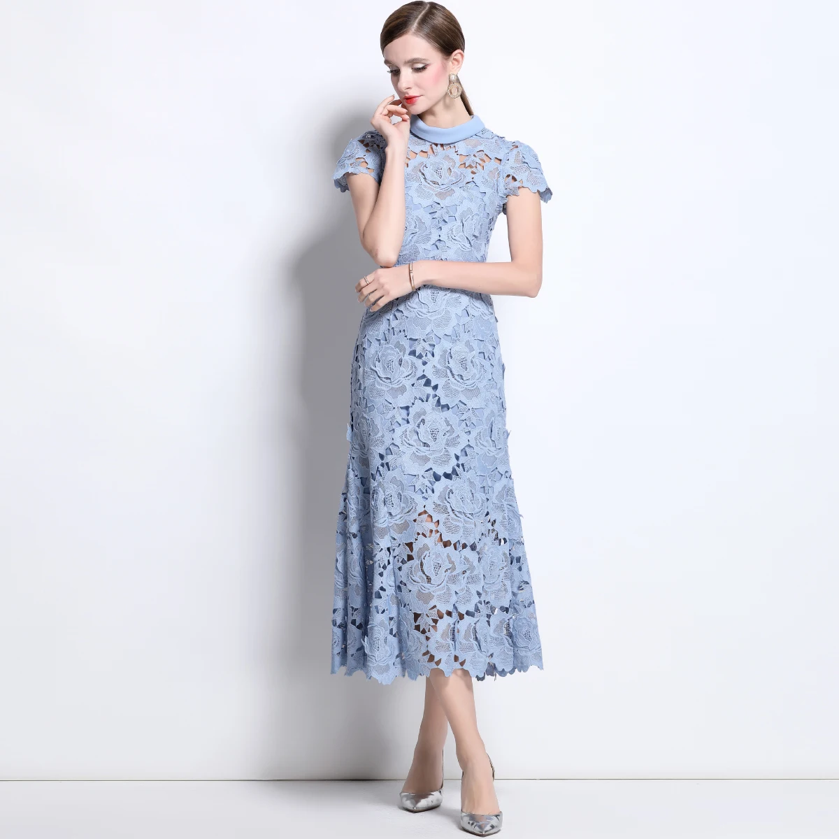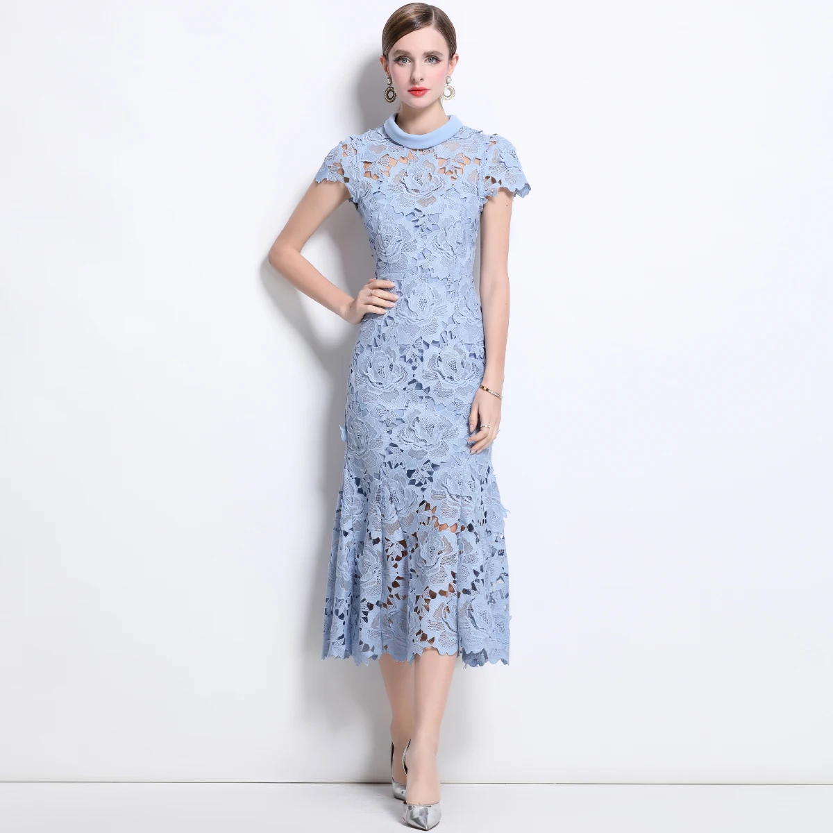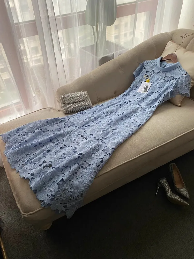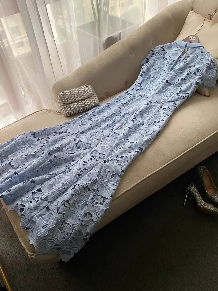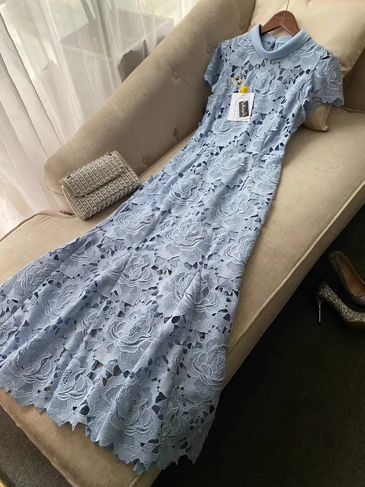 Prepare-se para brilhar com esse vestido estilo passarela, ideal para festas, casamentos, eventos noturnos e momentos que pedem sofisticação. Com um design digno de gala, ele une o requinte da renda bordada com o charme moderno dos recortes vazados (hollow out) e o romantismo das flores em crochê delicadamente aplicadas.